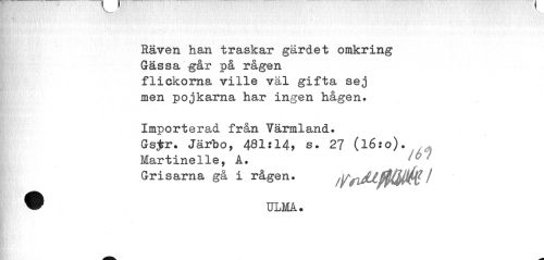 //// Räven han traskar gärdet omkring Gässa går på rågen flickorna ville väl gifta sej men pojkarna har ingen hågen. //// Importerad från Värmland. //// Gs£r. Järbo, 481:14, s. 27 (l6:o). //// Martinelie, A. //// Grisarna gå i rågen. /^fiMftW^ I ® ULMA. ////