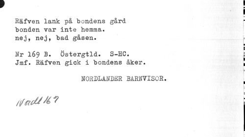 //// v //// Räfven lank på bondens gård bonden var inte hemma. //// «1 //// nej, nej, bad gåsen. ^ //// Nr 169 B. Östergtld. S-HC. I //// Jmf. Räfven gick i bondens åker. { //// [ //// NORDLANDER BARNVISOR. //// ¦ //// L- //// /tfficl/ti ? ////