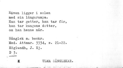 //// % //// Räven ligger i solen //// med sin långarumpa. //// Han tar getter, han tar får, //// han tar kungens dotter, //// om han henne når. //// Sånglek m. beskr. //// Med. Attmar. 3334, s. 21-22. //// Höglundh, J. Ej. //// D 3- //// ä ULMA SÅNGLEKAR. //// ••: * ////