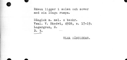 //// Räven ligger i solen och sover med sin långa rumpa. //// Sånglek m. mel. o beskr. //// Vsml. V. Skedvi, 4928, s. 17-19* //// Lagergren, E. //// D. 3. — //// ULM SÅNGLEKAR. ////