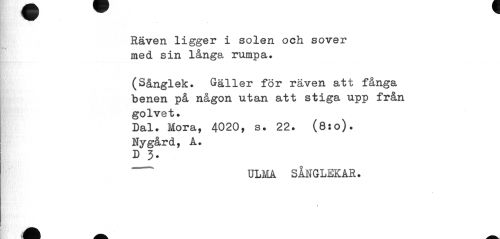 //// Räven ligger i solen och sover med sin långa rumpa. //// (Sånglek. Gäller för räven att fånga benen på någon utan att stiga upp från golvet. //// Dal. Mora, 4020, s. 22. (8:0). Nygård, A. //// D 3. //// ULMA SANGLEKAR. //// r ////