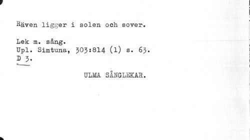 //// i //// Räven ligger i solen och sover. //// Lek m. sång. . //// Upl. Simtuna, 303:814 (l) s. 63. //// DJ; //// ULMA SÅNGLEKAR. //// ! //// i //// k. ////