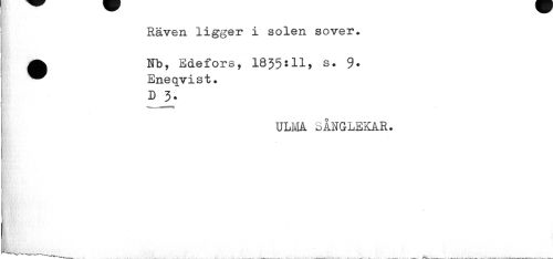 //// Räven ligger i solen sover. //// A Nb, Edefors, 1835:11, s. 9. //// ^^ Eneqvist. //// D 3- //// ULMA SÅNGLEKAR. ////