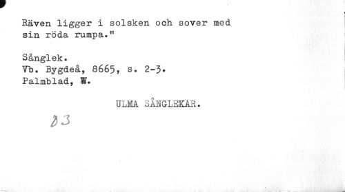 //// Räven ligger i solsken och sover med //// sin röda rumpa." t //// Sånglek. //// Yb. Bygdeå, 8665, s. 2-5• //// Palmblad, ¥. //// ULMA SÅNGLEKAR. //// 2)2 ////
