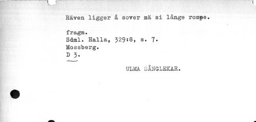 //// Räven ligger å sover mä si långe rompe. //// v //// fragm. //// Sdml. Hälla, 329:8, s. 7. //// Mossberg. //// ULMA. SÅNGLEKAR. ////