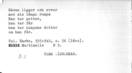 //// Haven ligger och sover med sin långa rumpa //// Han tar getter, , //// han tar får ; //// han tar kungens dotter I //// om han får, //// i //// ! //// Upl. Harbo, 303:942, s. 26 (l6:0). MMX Martinelle D 3. //// I //// i //// ULMA SÅNGLEKAR. I //// S> 3 i //// r i //// ! ////