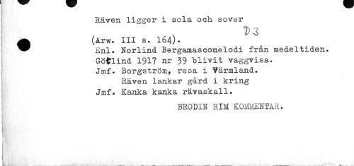 //// Räven ligger i sola och sover //// •(Arw. III s. I64). //// Enl. Norlind Bergamascomelodi från medeltiden. Götlind 1917 nr 39 blivit vaggvisa. //// Jmf. Borgström, resa i Värmland. //// Räven 1ankar gård i kring Jmf. Kanka kanka rävaskall. //// BRODIN RIM KOMMENTAR. //// . • ^ nf^^É^évbÉ ÉÉÉiäÉ k iiå__Mååå^__... ^äéå ////