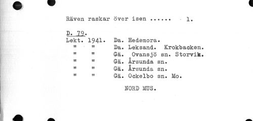 //// Räven raskar över isen... . 1. //// D- 21- //// Lekt. 1941* Da. Hedemora. //// 11 ' 11 Da. Leksand. Krokbacken. //// M 11 Gä. Ovansjö sn. Storvik. //// 11 tf Gä. Ar sunda sn. //// " " Gä. Årsunda sn. //// w 11 Gä. 0ekelbo sn. Mo. //// NORD MUS. ////