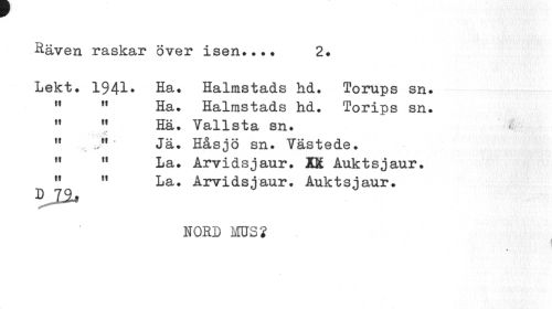 //// Räven raskar över isen... 2. //// Lekt. 1941* Ha. Halmstads hd. Torups sn. tf 11 Ha. Halmstads hd. Torips sn. » » Hä. Vallsta sn. //// J0 //// 9 ' 1 //// " Jä. Håsjö sn. Yästede. //// M 11 La. Arvidsjaur. XK Auktsjaur. //// w ,f La. Arvidsjaur. Auktsjaur. //// NORD MUS? //// i //// » ////