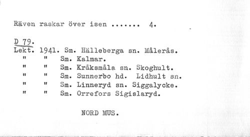 //// Räven raskar över isen ... 4* //// D 19. //// Lekt. 1941» Sm. Hälleberga sn. Målerås. //// ri 11 Sm. Kalmar. //// 11 H Sm. Kråksmåla sn. Skoghult. //// 11 11 Sm. Sunnerbo hd. Lidhult sn. //// 11 lt Sm. Linneryd sn. Siggalycke. //// 11 " Sm. Orrefors Sigislaryd. //// NORD MS. ////