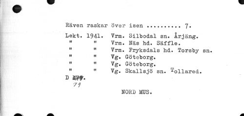 //// ^p A //// Räven raskar över isen... 7* //// Lekt. 1941* Vrm. Silbodal sn» Irjäng. //// 11 » Vrm. Näs hd. Säffle. //// 11 H Vrm. Fryksdals hd. Torsby sn. //// " 11 Vg. Göteborg. //// 11 11 Vg. Göteborg. //// 11 " Vg. Skallsjö sn. ^ollared. //// D l?f. 71 //// NORD MUS. ////