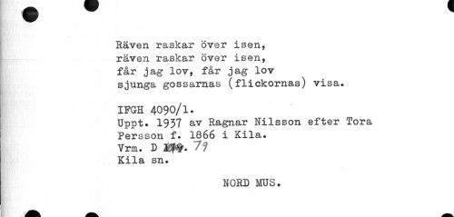 //// Räven raskar över isen, //// räven raskar över isen, //// får jag lov, får jag lov //// sjunga gossarnas (flickornas) visa. //// IFGH 4090/1. //// Uppt. 1937 av Ragnar Nilsson efter Tora Persson f. 1866 i Kila. //// Vrm. D Hfä. 7? //// Kila sn. //// NORD MUS. //// ^^^^ ^^^ - ////