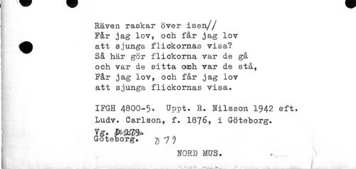 //// Räven raskar över isen// Får jag lov, och får jag lov i^k att sjunga flickornas visa? //// Så här gör flickorna var de gå och var de sitta occh var de stå, Får jag lov, och får jag lov att sjunga flickornas visa. //// IFGH 4800-5. Uppt. R. Nilsson 1942 eft. Ludv. Carlson, f. i876, i Göteborg. //// Gotel?org> jj 7 //// NORD MUS. -r. .. //// I I i i ilåäi i s i - 'åMi 'I > ¦ ////