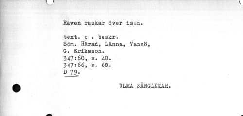 //// Räven raskar över isan» //// text. o . beskr. //// Sdm. Härad, Länna, Vansö, //// G. Eriksson. //// 347:60, s. 40. 347:66, s. 68. //// D 79- //// Q ULMA SÅNGLEKAR. //// « ////