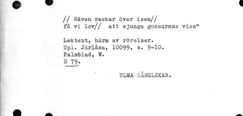 //// // Räven raskar över isen// //// få vi lov// att sjunga gossarnas visa" //// Lektext, härm av rörelser. //// Upl. Järlåsa, 10099, s. 9-10. //// Palmblad, W. //// DJ9- //// ULMA SÅNGLEKAR. ////