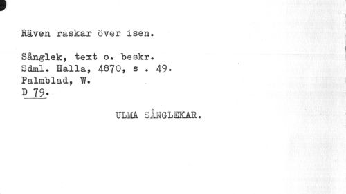 //// Räven raskar över isen. Sånglek, text o. beskr. //// Sdml. Halla, 4870, s . 49. //// Palmblad, W. i //// ULMA SÅNGLEKAR. ////