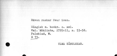 //// Räven raskar över isen. Sånglek m. beskr. o. mel. //// Vml."Möklinta, 2795:11, s. 53-58. //// Palmblad, W. //// £79 • //// A ULMA SÅNGLEKAR. ////
