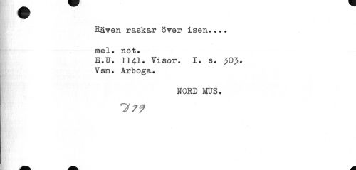 //// | //// Räven raskar över isen... mel. not. //// E.U. 1141. Visor. I. s. 303. Vsm. Arboga. //// NORD MUS. //// » ////