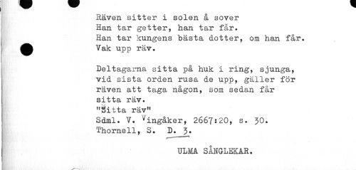 //// Räven sitter i solen å sover Han tar getter, han tar får. Han tar kungens bästa dotter, om han får. ^^ Vak upp räv. //// Deltagarna sitta på huk i ring, sjunga, vid sista orden rusa de upp, gäller för räven att taga någon, som sedan får sitta räv. //// "Sitta räv" //// Sdml. V. vingåker, 2667:20, s. 30. Thornell, S. D. 3. //// ...111 1 //// m //// ULMA SÅNGLEKAR. //// I1»}'. . //// --- ////