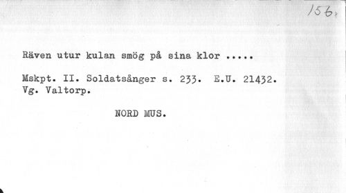 //// /O 6> //// j //// Räven utur kulan smög på sina klor ... //// Mskpt. II. Soldatsånger s. 233. E.U. 21432. Vg. Valtorp. //// NORD MUS. ////