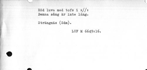 //// Röd luva med tofs i ://: Denna sång är inte lång. //// Strängnäs (Sdm). //// LUF M 6649s16. //// i ////