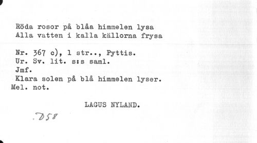 //// Röda rosor på "blåa himmelen lysa Alla vatten i kalla källorna frysa //// Nr. 367 c), 1 //// str.., Pyttis. Ur. Sv. lit. s:s saml. Jmf. //// Klara solen på blå himmelen lyser. Mel. not. //// LAGUS NYLAND. //// rtrr ////