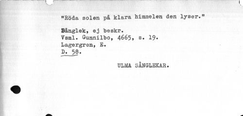 //// »Röda solen på klara himmelen den lyser." //// Bånglek, ej "beskr. Vsml. Gunnilbo, 4665, s. 19* Lagergren, E. Djl 5§. //// ULMA SÅNGLEKAR. //// ffi * ////