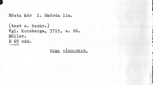 //// a //// i //// i— //// Rösta hör 1. Skörda lin. //// (text o. beskr.) \ //// Vgl. Korsberga, 3715, s. 66. I //// Möller. j //// D 65 odd. j //// ULMA SÅNGLEKAR. i //// i //// t //// - ////