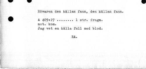 //// Bövaren den källan fann, den källan fann. //// A 409:27 ... 1 str. fragm. //// not. kom. //// Jag vet en källa full med blod. //// RA. //// ¦ j • 4 < i i i- - _i ' / ////