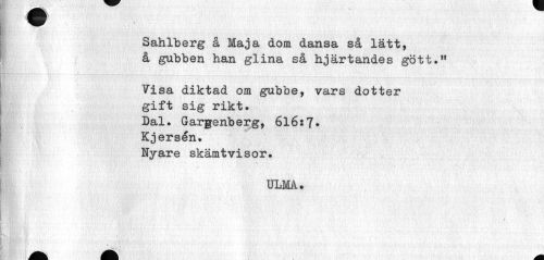 //// Sahlberg å Maja dom dansa så lätt, å gubben han glina så hjärtandes gött." //// Visa diktad om gubbe, vars dotter gift sig rikt. Dal. Gargenberg, 616:7* Kjersén. //// Nyare skämtvisor. //// ULMA. ////