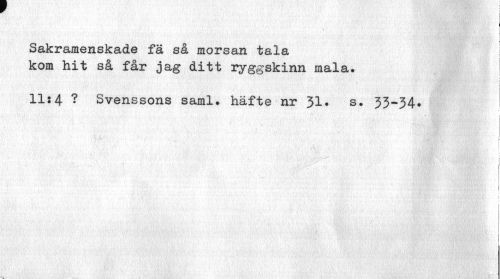//// Sakramenskade fä så morsan tala //// kom hit så får jag ditt ryggskinn mala. //// i //// 11:4 ? Svenssons saml. häfte nr J>1. s. 33-34* //// i ////