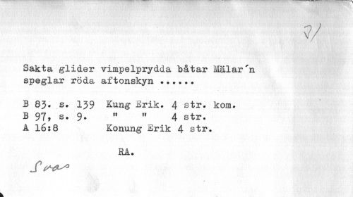 //// v //// Sakta glider vimpelprydda båtar Mälar 'n speglar röda aftonskyn... //// B 83. s. I39 Kung Erik. 4 str. kom. //// B 97, s. 9. w " 4 str. //// A 16:8 Konung Erik 4 str. //// RA. ////