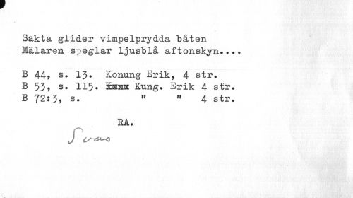 //// Sakta glider vimpelprydda båten Mälaren speglar ljusblå aftonskyn»... //// B 44, s* 13* Konung Erik, 4 str. B 53, 115* S&sra Kung. Erik 4 str. B 72:3, s. ff " 4 str. //// RA. ////