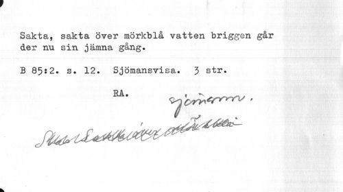 //// Sakta, sakta över mörkblå vatten briggen går der nu sin jämna gång. //// B 85$2. s. 12. Sjömansvisa. 3 str. //// RA. t - , ////