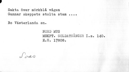 //// Sakta över mörkblå vågen Gunnar skeppets stolta stam ... //// Bo Vasterlanda sn. //// NORD MUS //// MSKPT. SOLDATSANGER I.s. 140. E.U. 17808. //// <zPS^atsd ////