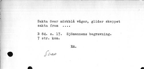 //// Sakta över mörkblå vågor, glider skeppet sakta frs,m ... //// B 84. s. 17* Sjömannens begravning. 7 str. kom. //// RA. ////