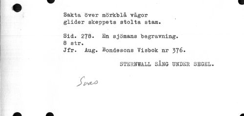 //// Sakta över mörkblå vågor //// i //// glider skeppets stolta stam. //// .1 //// Sid. 278. En sjömans begravning. 8 str. //// Jfr. Aug. Bondesons Visbok nr 376• //// STERNWALL SÅNG UNDER SEGEL. ////