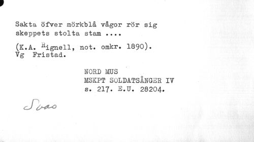 //// Sakta öfver mörkblå vågor rör sig skeppets stolta stam ... //// (K.A. Eignell, not. omkr. 1890). Vg Fristad. //// NORD MUS //// MSKPT SOLDATSÅNGER IV s. 217. E.U. 28204. //// cJ ////