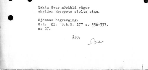 //// Sakta över mörkblå vågor skrider skeppets stolta stam. //// ^^ Sjömans begravning. //// 8:4« Kl. S.L.S. 277 s. 336-337. nr 27. //// ÅBO. ////