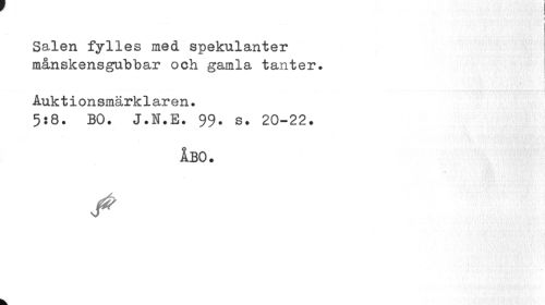 //// ! //// Salen fylles med spekulanter månskensgubbar och gamla tanter. //// Auktionsmärklaren. //// 5:8. BO. J.N.E. 99. s. 20-22. //// ÅBO. ////