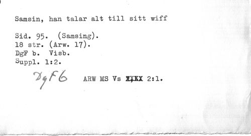 //// Samsin, han talar alt till sitt wiff //// • -iftiSjTK^v //// Sid, 95* (Samsing). //// 18 str. (Arw. 1?). DgF b. Yisb. //// Suppl. 1:2. //// ARW MS Vs XPX 2:1. //// > //// i ////