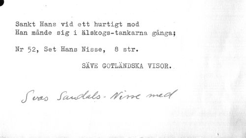 //// \ //// Sankt Hans vid ett hurtigt mod //// Han månde sig i älskogs-tankarna gånga; //// Nr 52, Set Hans Nisse, 8 str. //// SA VE GOTLANDSKA VISOR. . //// fö I. v'*<. <'}*, ' //// ¦ * "I //// i. 'A.& ätfi? .« ////