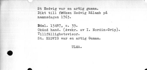 //// St Hedvig var en artig gumma» Dikt till fröken Hedvig Rålamb på namnsdagen 1763. //// \ //// Bdml. 13487, s. 39» //// Okänd hand. (Avskr. av I. Nordin-Grip). //// tillfällighetsvisor. //// St. HEDVIG var en artig Gumma. //// ULMA. ////