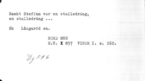 //// i //// Sankt Staffan var en stalledräng, en stalledräng ... //// • j //// Sk Långarcd sn. //// NORD MUS //// E.U. X 857 VISOR I. s. 262. ////