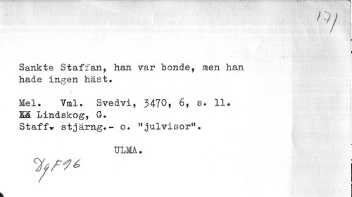 //// ry //// Sankte Staffan, han var bonde, men han hade ingen häst. //// * //// * i Mel. Vml. Svedvi, 3470, 6, s. 11. M Lindskog, G. //// Staff» stjärng.- o. !tjulvisor11. //// ULM. //// i ; ////