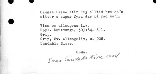 //// Sannas Lasse står sej alltid bsa sa'n sitter o super fyra dar på rad sa'n. //// Visa om allmogens liv. //// Uppl. Skuttunge, 303:64- 8-1. //// Grip. //// Grip, Sv. Allmogeliv, s. 208. Sandahls Nisse. //// ULMA. //// jw, X-^ w ////