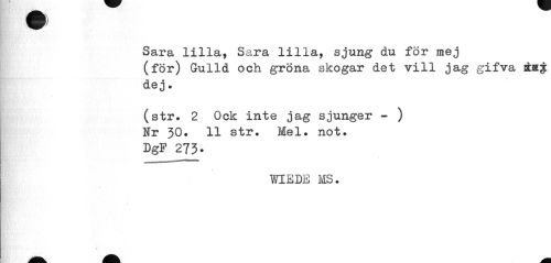 //// Sara lilla, Sara lilla, sjung du för mej //// (för) Gulld och gröna skogar det vill jag gifva steg: //// dej. //// (str. 2 Ock inte jag sjunger - ) Nr 30. 11 str. Mel. not. //// DgF 273. //// WIEDE MS. ////