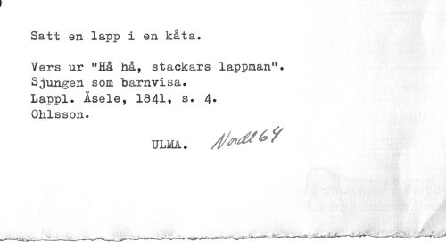 //// Satt en lapp i en kåta. //// Vers ur "Hå hå, stackars lappman". Sjungen som barnvisa. Lappl. Åsele, 1841, s. 4* Ohlsson. //// ULMA. //// ¦ ////