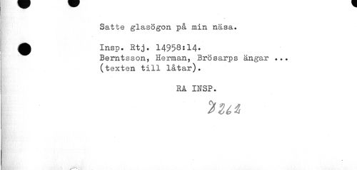 //// Satte glasögon på min näsa. //// ^ Insp. Htj. 14958:14. //// Berntsson, Herman, Brösarps ängar ... (texten till låtar). //// RA INSP. //// i za ////