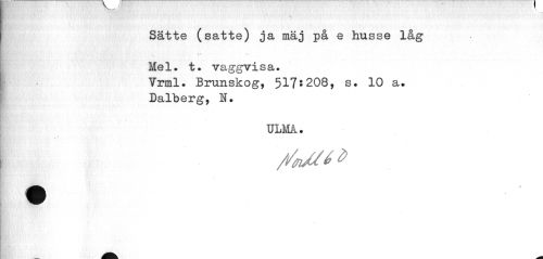 //// Sätte (satte) ja maj på e husse låg //// Mel. t. vaggvisa. //// Vrml. Brunskog, 517*208, s. 10 a. //// Dalberg, N. //// ULMA • ////